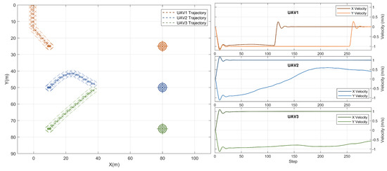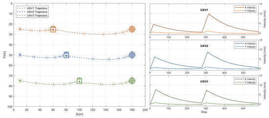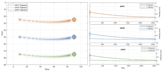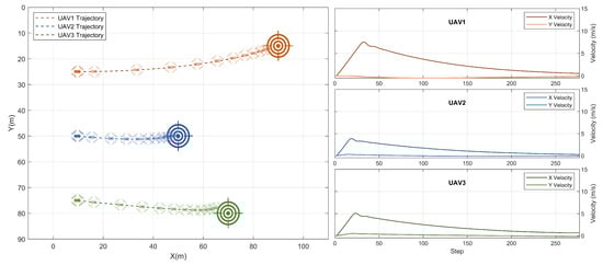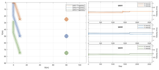 In this example, the agents were assigned target locations at variable distances from the UAVs’ initial locations, in both dimensions (). Figure 6 shows the scenario and the obtained results using the proposed approach. UAV1 (in orange) has to travel the longest distance, followed by UAV2 (in green), and lastly UAV3 whose target location is the closest. Because of the centralized training nature, the decentralized policies exhibit collaborative behavior and are able to effectively achieve the goal of the swarm. In order for the three UAVs to arrive at their goal locations at the same time, the agents generated reference velocities based on each UAV’s distance from its target. Obviously, UAV1 was the fastest, followed by UAV3, and then UAV2. In the y dimension, the generated reference velocities were also different since the target locations were above, below, and along the initial location for UAV 1, 3, and 2 respectively. The maximum swarm speed was 8 m/s and the swarm goal was achieved after approximately 270 steps. The speed of each UAV was drastically reduced near the goal position.