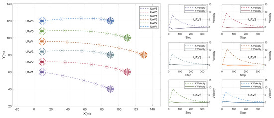 The results illustrated in Figure 8 show an example scenario where six UAVs have maneuvered into a triangular formation starting from their initial positions where they were lined up at . The target locations were set at various distances in x and y dimensions. At any time instance, every UAV may observe the closest two members in the swarm. The velocity plots in the same figure show how each decentralized agent generated different reference velocities depending on the relative distance between the UAV and its corresponding target, to allow all UAVs to achieve their goals at the same time.