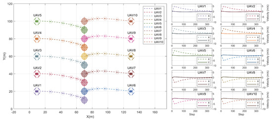 Figure 9 demonstrates another formation scenario where ten UAVs were assigned colinear target locations starting from opposite sides in the environment. In this example, the MARL agent was responsible for generating the magnitudes of the reference velocities and an external function was used to decide the direction of the velocity based on each agent’s relative position to its target. All ten UAVs were able to be within 2 m of the set target locations at the same time and all the flights show a high level of smoothness. The cooperative task was completed in 34 s.