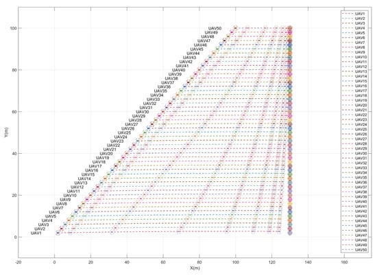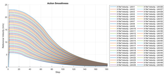 In this section, a test with a swarm of 50 UAVs was conducted to demonstrate the ability of the proposed approach to generate smooth actions across consecutive steps. Every UAV started from a different position in the environment and was assigned a target location at a different distance than the other members in the swarm. This test shows the flexibility and the generalizability of the proposed approach and proves that oscillatory behavior is not encountered over a large range of states and actions. The trajectories followed by the UAVs are depicted in Figure 10 and the corresponding actions in the x direction are shown in Figure 11. The same test was repeated with much lower velocities and oscillations were not encountered at all.