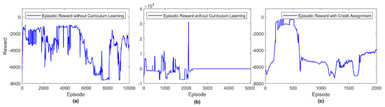 Without curriculum learning and early stopping, the convergence of the model is much more challenging due to the large environment size, continuous action and state spaces, multi-agent setting, limited observability, and the instability of the environment in presence of multiple dynamic entities at the same time. Figure 13a,b show examples of unstable training of the same model if exploration is performed in one shot. It is worth noting that positive rewards were achieved in these cases because of the positive component of the reward formulation that an agent receives when it arrives at its target location. Larger positive episodic rewards mean that one or two agents were at their target locations accumulating the positive rewards while waiting for the remaining two or one agent, respectively, to arrive at their target location. The latter agents in such cases would be exploring a different area in the environment and hence the episode was not terminated, until the specified number of steps ended. Furthermore, Figure 13c shows the episodic rewards of the same model with credit assignment as proposed in [25], where decentralized agents do not use the global reward to update their parameters, but rather a reward value that reflects their contribution to the success of the task. Every episode may extend to 3000 steps if no collisions between the UAVs happened. It is worth noting that the highest reward values, in this case, were achieved due to the early termination of the training episode, and hence the negative penalty corresponding to the Euclidean distance to the target location was not accumulated for a long time. A sample testing scenario with credit assignment where the collaborative navigation task was not achieved is shown in Figure 14. These examples demonstrate the importance of curriculum learning to the training convergence and task achievement.