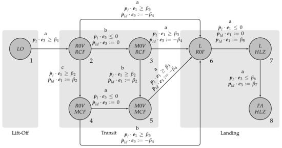 The differential equations for the purpose of the desired experiment consist of, depending on the stage, some combination of constant acceleration, velocity, or position. Unless otherwise specified, the components of the acceleration are zero. has a constant upwards velocity and a constant x position; has a downwards acceleration, has a constant height, has a constant forward acceleration; has a constant forward velocity; L has a constant downward velocity; has a backwards acceleration; has a constant x position; has a constant height.
