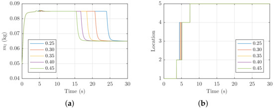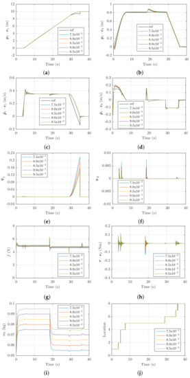 Figure 5i) is also fast, converging with a settling time of two seconds to the real value at the start of the simulation and after the mass change. Additionally, the mass estimate has no overshoot, with sudden changes resulting from location changes. The largest values of the