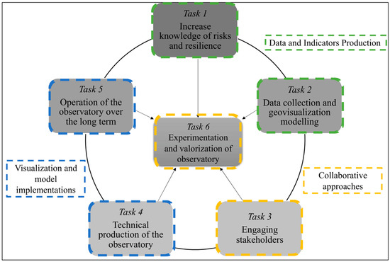 The utilization of UAVs in French Polynesia is relatively recent, and its development to serve as an effective and efficient tool for the territory has just begun [12,13,17,44,45]. This aerial data tool provides valuable information and is capable of providing the raw data needed to fulfill the objectives listed by Gonçalves and Henriques (2015) for effective coastal management. However, it is through linking this aerial data source with a spatial decision support system such as the Resilience Observatory that this data becomes tangible knowledge that can aid the decision-making process. The utilization of the Resilience Observatory as a spatial decision-support system in French Polynesia is also still in the embryonic phase. Some studies have been conducted on the operationalization of the concept of resilience and its application to an observatory [43,61,62,63,64,65,66]. These studies have begun to identify the role that the Resilience Observatory will play, its internal functions, existing strategies and tools aimed at facilitating the operationalization of the concept, and how it will valorize data to support said observatory. Ref. [62] identifies the different tasks of the Resilience Observatory and breaks them up into three different categories (Figure 1). This review aims to show that using UAVs as data sources and their postprocessing procedures for analysis can efficiently and effectively support the first two tasks: data collection and indicator production.