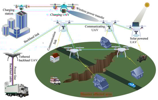 In addition to the capacity enhancement purposes, UAV-BSs can also be used in emergency scenarios, including earthquakes, floods, etc., where the fixed infrastructure is either fully or partially damaged and down [14]. Since the end-to-end connectivity cannot be provided in such scenarios, UAV-BSs come as helping hands, such that they are sent to affected regions and operate either as standalone BSs in place of the damaged ones or as a relay BS that relays the data to the nearest healthy node of the communication system. This is an important vertical of UAV-assisted wireless networking, as in such scenarios, the transmitted message would be critical and can save the lives of people.