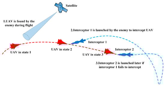 As shown in Figure 1, the application scenario of this paper is: during the flight of the UAV, it is found and continuously tracked by the enemy in state 1, then it is intercepted by interceptor 1 in state 2, which is launched by the enemy. If the UAV successfully evades interceptor 1 at this time, during the subsequent flight, the enemy will continue to launch interceptor 2, so as to conduct the second interception in state 3.