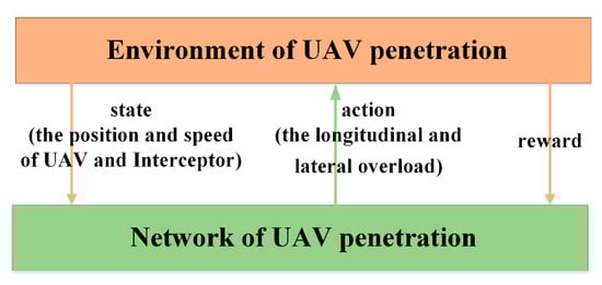 The interaction process between the network and the environment in training is shown in Figure 2: (1) the network first obtains the state information from the environment, including the position and speed information of the UAV and Interceptor; (2) the network outputs the corresponding action command (the longitudinal overload command and lateral overload command) according to the above state information, for controlling UAV flight; (3) the UAV executes the above action command, the current state is changed, and the corresponding reward value of this action command is obtained. Through continuous interaction with the environment, the network gradually collects samples and updates iterations, so as to continuously improve the reward value, and finally converges to obtain a satisfied network of UAV penetration.