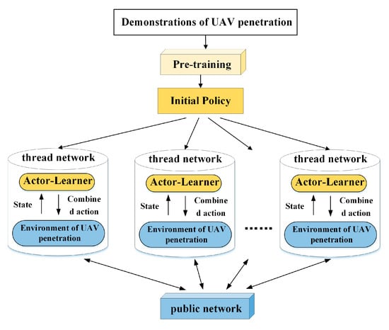 Combining the results of the pre-training algorithm, the distributed reinforcement learning algorithm can further reduce the sample demand, thus improving the speed of training. As an excellent distributed reinforcement learning algorithm, the asynchronous advantage actor-critic (A3C) algorithm [15] adopts asynchronous training, which is based on the advantage actor-critic (A2C) algorithm [16]. The A3C algorithm greatly improves the convergence efficiency, and is quite suitable for UAV penetration training, which needs to reduce the time and capital cost as much as possible. Therefore, the A3C algorithm is initially selected as the distributed reinforcement learning algorithm for UAV penetration.