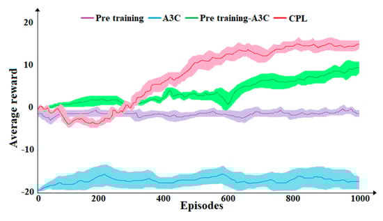 According to the above analysis, this paper compares the pre-training algorithm, A3C algorithm, pre-training-A3C algorithm, and CPL algorithm, to analyze the performance of four algorithms in the UAV penetration environment. The pre-training-A3C algorithm is a combination of the A3C algorithm and pre-training algorithm using the direct replacement method. Specifically, the average reward of the above four algorithms in the training process is shown in Figure 5 and the success rate of penetration in the training process is shown in Figure 6.