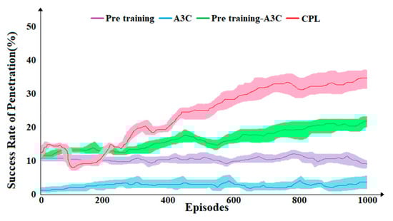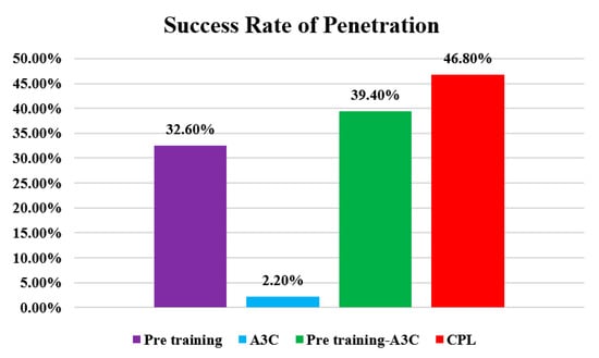 The changing trend of the success rate of penetration in Figure 6 is in accordance with that of the average reward in Figure 5, which also shows the correctness and rationality of reward shaping. From the training results in Figure 5 and Figure 6, the CPL algorithm proposed in this paper has the highest convergence speed and the best convergence performance, thus verifying its feasibility and effectiveness. However, the above results are only the performance in the training process. To objectively verify the apply effect of each algorithm, a test experiment should be conducted after the training.