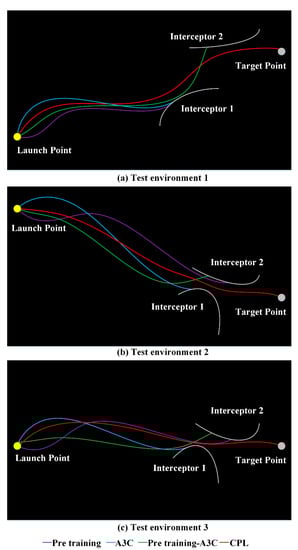 Three groups of experimental results were randomly selected from the above 500 test results, as shown in Figure 8. It can be seen from Figure 8 that only the CPL algorithm can completely break through the defense of Interceptor 1 and Interceptor 2 in Test environments 1, 2, and 3, while the other three algorithms cannot completely break through the defense of the two interceptors, which also shows the excellent performance of the CPL algorithm in UAV penetration.