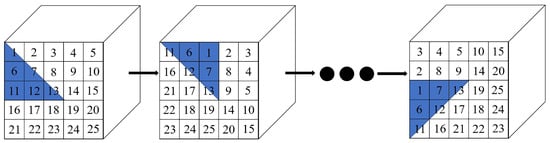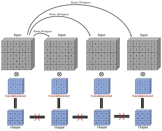where and denote the new coordinates of the rotated feature. However, without additional constraint conditions, the feature-level rotation may still lose features, which are shown in Figure 2B. For instance, according to Equation (1), the feature at the coordinate position (−2, −2) will be lost after rotation, while the features at the coordinate positions (−2, 0) and (−1, 0) will have the same new coordinate position (−1, −1) after rotation, resulting in two overlapping features. Figure 2C shows that the proposed feature-level rotation is capable of effectively maintaining all features to address the problem of rotational invariance without the introduction of additional conditions.