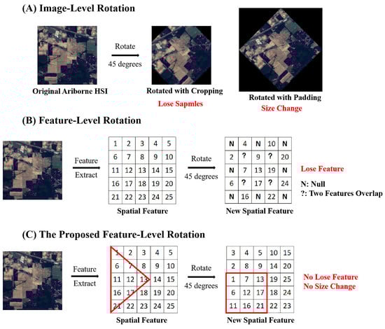 An airborne hyperspectral imaging system is typically equipped on an aircraft or UAV to capture ground scenes from an overlooking perspective. As a result of the rotation of the UAV, the HSI in the same area has different perspectives [13]. While spatial rotation does not typically cause degradation of classification accuracy for spectral-based methods, spectral feature methods do not perform as well as spectral-spatial feature methods, which are sensitive to spatial rotation, as shown in Figure 1. For convenience, the input is set to have one spectral band. The kernel size is . The image size is . The stride and padding of convolution are 1 and 0, respectively. Figure 1 shows that different features are extracted from the same image with different input angles using the same convolutional kernel. transformer-based methods face similar problems. The input image rotation causes a change in the output. Therefore, the spatial-spectral methods perform poorly when the images are rotated. In order to address this issue, some work has made meaningful attempts to explore it. Tao et al. [54] utilized vector sorting to extract rotation-invariant features. Zheng et al. [13] used spectral convolution to extract spatial features to maintain rotation invariance. Chen et al. [55] presented using feature rotation to address the rotation invariance of UAV images. Figure 2 illustrates common methods for addressing rotation invariance. Figure 2A shows that the image-level rotation may lose samples or changes the image size. According to [55], the coordinates of each feature are . The rotation by degrees is expressed as: