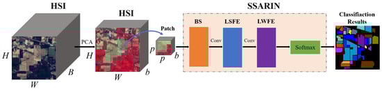 Let represent the patch, a square area cut from the HSI . represents the hyperspectral image after principal components analysis (PCA). denotes the i-th patch of the hyperspectral image . is the spatial size. The pixel represents the center pixel of the patch . Each pixel has a corresponding patch in the HSIs. Thus, the proposed SSARIN is utilized to determine the class of the pixel based on patch .