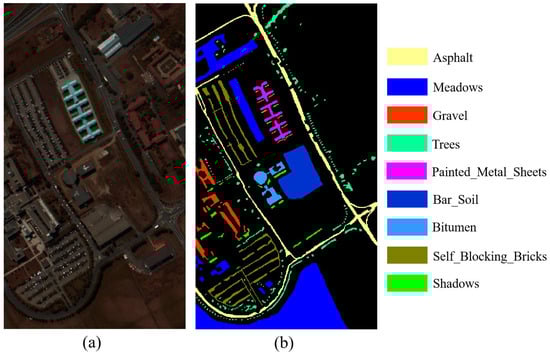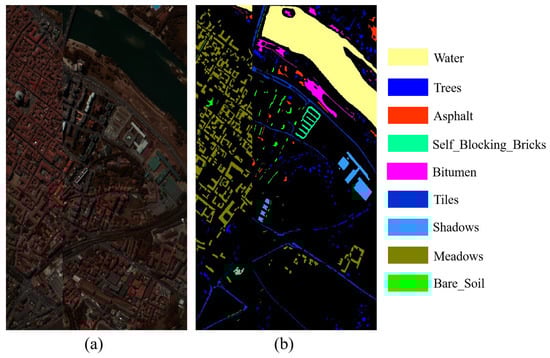 Figure 10. Pavia University dataset. (a) Pseudo-color image. (b) Ground truth.