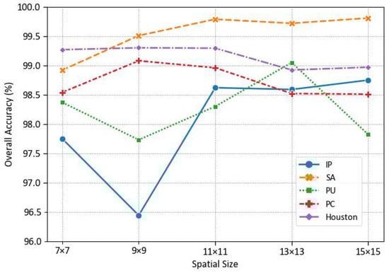 Figure 6 shows an example. The blue area has a central pixel angle of . The radius of this area is . represents the size of the spectral-spatial feature. stands for rounding up. For instance, the size of the spatial-spectral feature is . The radius of the rotation area is 3. After determining the region’s size, each rotation of produces a new spatial-spectral feature. As shown in the second spatial-spectral feature in Figure 6, the blue region rotates to the corresponding position, and other regions rotate similarly. Therefore, the original spatial-spectral feature generates eight spatial-spectral features. This approach has the following benefits. (1) This approach is intuitive and straightforward to understand. (2) It can extract the position relationship between pixels without changing the shape of spatial-spectral features. (3) New spatial-spectral features can be directly fed into the network to extract features. (4) This module enhances the spatial features of the central pixel and improves the accuracy for the central pixel category.