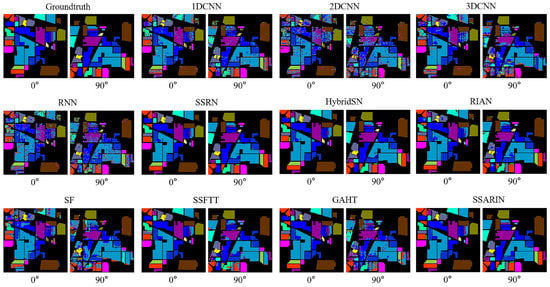 Table 20. OA (%) with different rotation angles for the different methods on the PC dataset.To further evaluate the compared algorithms, the metrics at 90 degrees are shown in Table 21. SSARIN maintains the best performance of the OA, AA, and Kappa. At the same time, the performance of each method is represented intuitively in Figure 17.