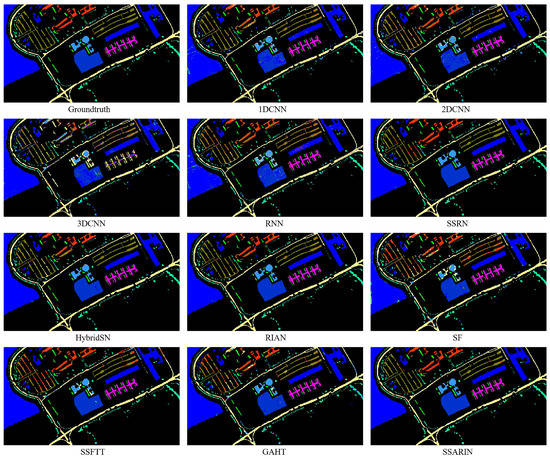 Table 18. OA (%) with different rotation angles for the different methods on the PU dataset.To further evaluate the compared algorithms, the quantitative indicators at the rotation of 270 degrees are shown in Table 19. SSARIN maintains the best OAs in four classes. Meanwhile, it has the best performance of the OA, AA, and Kappa. Figure 16 shows the performance of each method intuitively. Furthermore, the classification map of SSARIN is smooth.