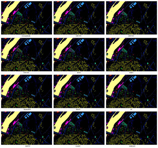 - Pavia Center: Table 20 lists the OAs of all the algorithms at different rotation degrees. The OAs of 1D CNN, RNN, RIAN, and SSARIN at 0, 90, 180, and 270 degrees are 97.44%, 97.34%, 98.35%, and 98.05%. The above methods are both rotation invariant. When the rotation degree is 0, the performance of SSARIN has the best performance. When the rotation degrees change, the OAs of 2D CNN, 3D CNN, SSRN, HybridSN, SF, SSFTT, and GAHT drop significantly. At a rotation degree of 90, the performance of these methods decreased by 0.88%, 1.79%, 0.13%, 0.05%, 1.08%, 1.18%, and 0.86%. Compared to the IP, SA, and PU datasets, these algorithms do not have much accuracy degradation on the PC dataset. Our analysis is due to the small number of categories in the PC dataset and the concentration of sample areas.