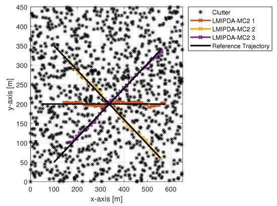 The two-dimensional initial position vectors of targets 1, 2 and 3 are , and , respectively, as shown in Figure 2. These closely moving targets in the occlusion certainly crossed near the coordinate points at approximately in scans 19 and 20; in which, Targets 2 and 3 met in scan at the same position with only 3 difference in their altitude. The information about the initial positions of targets is supplied to the LMIPDA-MC2 algorithm but their dynamic motion is not known. The information about the two-dimensional velocity vector of the target state is obtained by using Equation (26) in the track-initialization process. Therefore, the target’s identities are untagged, and their measurements are randomly merged with the background clutters. Thus, the proposed filter uses a series of position measurements observed over time using Equation (7), including statistical noise and other measurement inaccuracies to produce estimates of unknown state variables that tend to be more accurate and realistic scenarios.