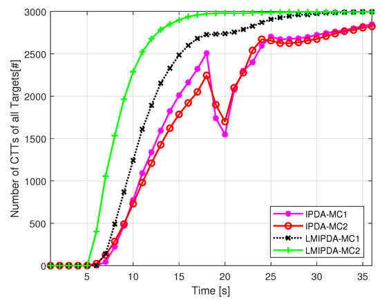 We verified the FTD results again using Monte Carlo simulation for 1000 runs as shown in Figure 4. The simulation parameters and surveillance scenario is the same as before. We can see that the reference methods have slower rates of track confirmation. Both the IPDA-MC1 and IPDA-MC2 algorithms lost almost CTT. This track lost is due to the measurement occlusion. The standard LMIPDA method, which uses the MC1 model lost few of its confirmed tracks near the occluded scans to . However, after occlusion scan , the tracking response of LMIPDA improved well as compared to IPDA-type filters. In comparison to the reference methods, the proposed LMIPDA-MC2 significantly improved the FTD performance. Thus, the purpose of the LMIPDA-MC2 is useful and feasible in the application of multi-target-tracking systems.
