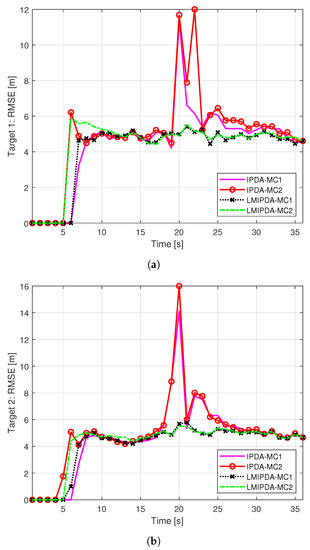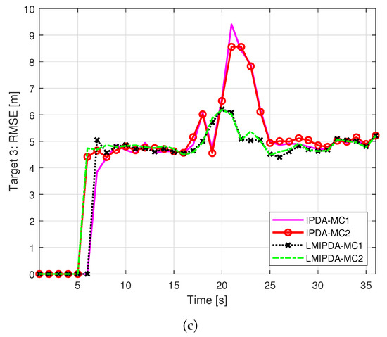The position-estimation error of the targets () is calculated using the root mean square error (RMSE) process with respect to each CTT as illustrated in Figure 5a–c. The RMSE statistics were accumulated for only 200 simulation runs since the analytical results remained the same. Both LMIPDA-MC1 and LMIPDA-MC2 had similar trends of RMSE statistics; however, the RMSEs of both IPDA-MC1 and IPDA-MC2 were higher specifically at the occluded scans to as depicted in Figure 5. This shows that the growth of track PTE is slow in case of both IPDA-MC1 and IPDA-MC2 in the occluded and cluttered environment. The RMSE statistics of the algorithms converged at the final scan because they used the same measurement set collected in scan to conclude the simulations.