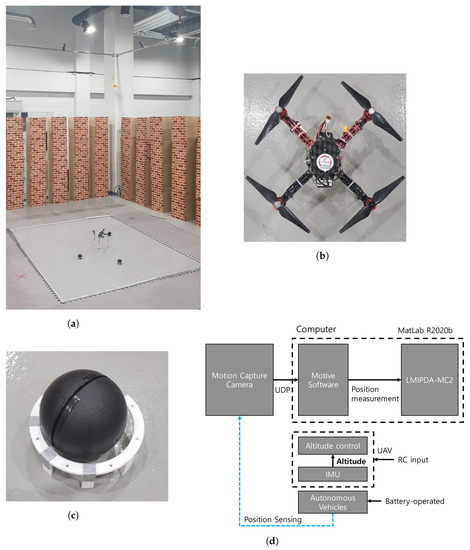Experimental platform: (a–c) are reprinted from Expert Systems with Applications, 177, Myunggun Kim, Sufyan Ali Memon, et al., Dynamic based trajectory estimation and tracking in an uncertain environment, Page No. 7, Copyright (2021), with permission from Elsevier. (a) Surveillance region. (b) UAV. (c) Autonomous vehicle. (d) Experimental setup.