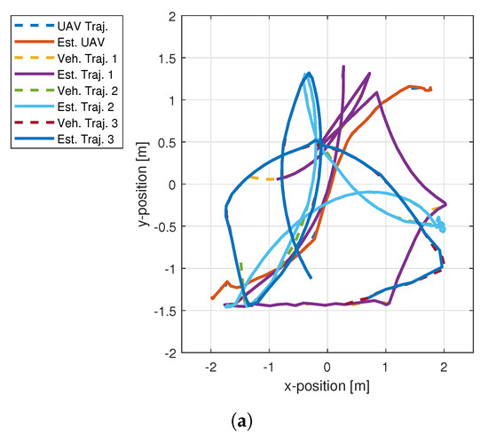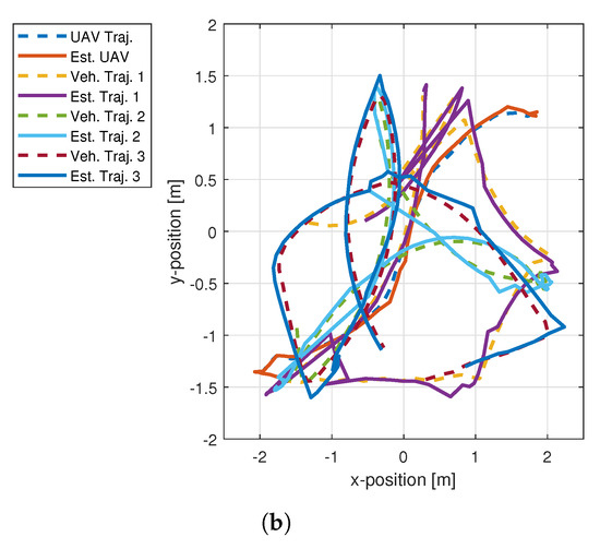The tracking performance of both methods were compared by estimating their trajectories in occlusion situations as shown in Figure 7a,b. Both the LMIPDA-MC1 and LMIPDA-MC2 methods used the three-dimensional state propagation and process noise covariance matrices in Equation (6) to compute the motion of each vehicle, including the UAV. These matrices are same as expressed in Equations (27) and (28); however, the two-dimensional identity and zeros matrices must be converted in to three-dimensional matrices.