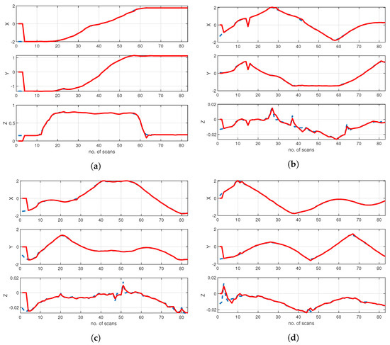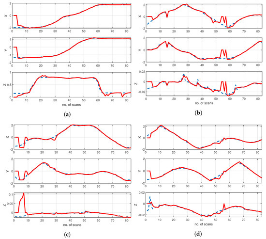 Figure 8 shows the position estimation of a UAV and autonomous vehicles in the x-, y- and z-axes using the proposed LMIPDA-MC2 method, whereas Figure 9 shows the position-estimation results of LMIPDA-MC1 in the three-dimensional coordinate system.