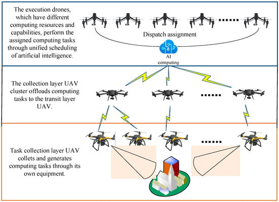 As shown in Figure 1, this paper studies the task scheduling and resource allocation problems in the cluster of UAVs, with the executing UAVs as edge servers to assist in computing. The UAVs keep the task data in the system and compensate for the lack of computing power and the need for long endurance of the IIN terminals. In this paper, we assume that UAVs have continuous input energy and meet the energy demand for any activity. Thus, the energy consumption of UAVs is ignored in this paper []. The system model uses a three-layer UAV cluster structure, and each of the three layers of UAVs has different functions. Each UAV’s position is represented by a three-dimensional coordinate (x, y, z).