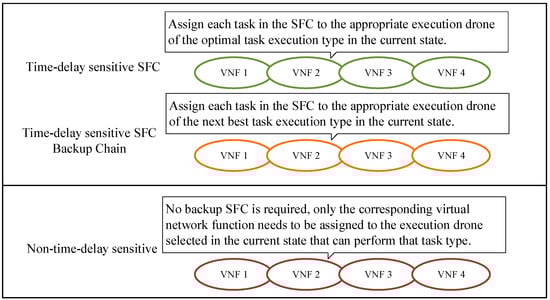 As shown in Figure 3: The SFCs in the system are divided into latency-sensitive and non-latency-sensitive, which are marked by location-specific values in the code. Latency-sensitive SFCs are assigned more computational resources and backup VNFs to ensure the speed and stability of task execution, and to guarantee the time efficiency of latency-sensitive SFCs to complete tasks. Take a backup SFC as an example, when executing a task, the latency-sensitive SFC first selects the best execution layer UAVs to execute the task according to the algorithm policy, while the backup SFC selects the second best execution layer UAVs to execute the task at the same time according to the algorithm policy. The benefit of the same SFC being executed by multiple different device chains in parallel has the following advantages: the crash of a single link device does not affect the execution stability of other links and improves the task execution reliability.