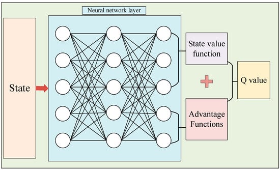 where is the state value function, representing how much reward can be obtained from state s, and is the dominance function for taking different actions in that state, indicating the superiority of taking action a in state s compared with other actions; η is the network parameter shared by the state value function and the dominance function, which is generally used in neural networks to extract the first few layers of features; and α and β are the parameters of the state value function and the dominance function, respectively. The Dueling DQN model divides the last layer of the neural network into two parts, the state value function and the dominance function, and no longer lets the neural network output the Q-value directly, the state value function and the dominance function sum up to obtain the Q-value. The network structure of Dueling DQN is shown in Figure 5.
