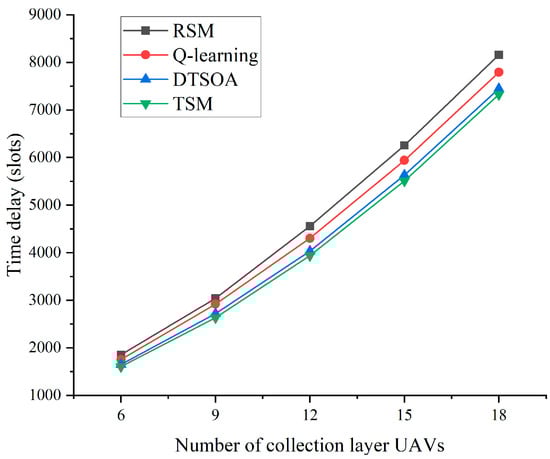 Figure 7 shows the performance simulation of the impact of the number of collection layer UAVs on the total system delay. As can be seen from the figure, compared with Q-leaning and RSM, the DTSOA proposed in this paper has optimal performance as the link length of the SFCs changes (i.e., during the change in the number of VNF subtasks contained in each SFC) and the achieved results are closer to the TSM curve. Furthermore, fewer computational tasks are generated in the corresponding system when the number of collection layer UAVs is smaller, where the gap between these four algorithms is the smallest since more computational resources are left for each execution layer UAVs at this time. The DTSOA algorithm analyzes the generated computational tasks and the server resource usage to efficiently schedule the system resources and obtain better results. Q-learning also uses computational tasks and server state as input of the algorithm. However, the Q-value of one state action pair can only be updated in each training iteration, and there is a problem of overestimation of the Q-value due to the internal design defect of the algorithm, which affects the algorithm results. Therefore, compared with Q-learning, DTSOA learns the state value function more frequently and accurately to select better actions and reduce the system latency.