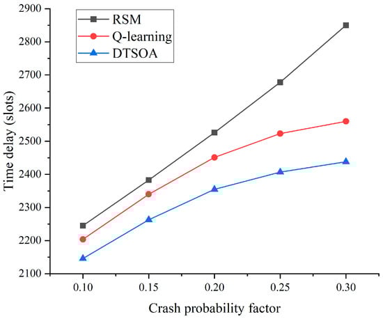 Figure 8 shows the effect of increasing the crash probability factor on the total system delay. The simulation parameters are set as: . From the figure, it can be seen that RSM has the highest system latency affected by the crash probability coefficient, because only the nearest execution layer UAVs are selected for task offloading execution. Q-learning, DTSOA and TSM schedule the computation of task execution positions based on the working status of all execution layer UAVs in the system, which reduces the impact of the crash probability coefficient on the total system latency. DTSOA has better performance through the advantage of the algorithm design; the growth curve is closer to TSM compared to other baseline algorithms.