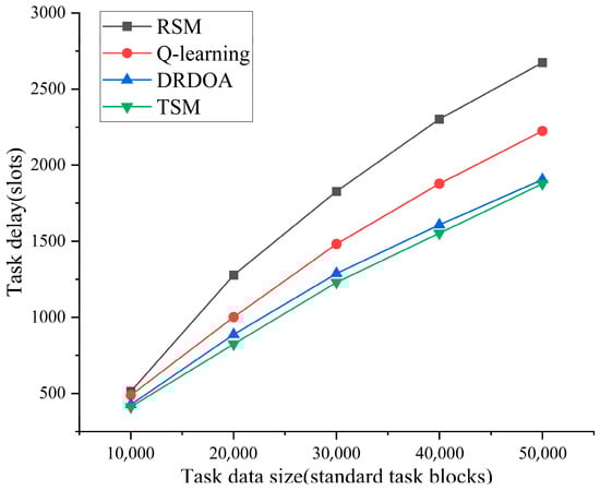 Figure 9 investigates the relationship between the amount of task data and the time delay. The simulation parameters are set as: . The simulation results show that, compared with the results in Figure 8, all these four algorithms more fully utilize the system resources, and reduce the total latency in the system to a certain extent by increasing the number of SFC tasks with the same total task data volume. RSM is less efficient in utilizing the overall resources in the system than the other algorithms in the case of multiple tasks and large data volume. The DTSOA proposed in this paper, however, is still closer to the results of TSM than Q-learning and RSM in the face of multiple tasks counts and large data volumes, and is able to obtain a lower total system latency. Therefore, in the complex work scenario facing multiple SFC tasks, the performance of the DTSOA algorithm proposed in this paper is more advantageous in providing resource scheduling services to users.