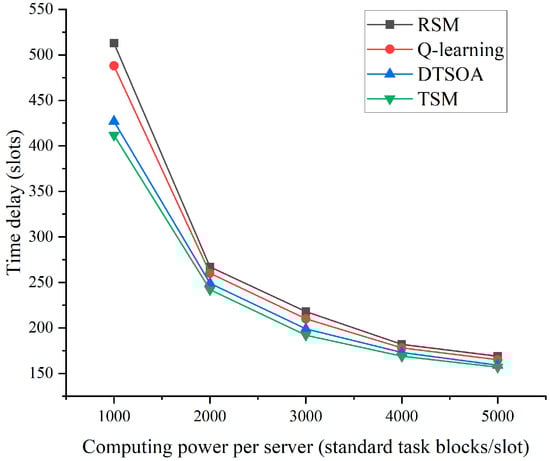 Figure 10 shows the relationship between the computational power and the latency of the executed UAVs. The simulation parameters are set as: . The simulation results show that the system latency under all four algorithms decreases as the computational power of the device increases. The reason for the gradual slowdown of the reduction is that too many computational resources are wasted in the face of a fixed computational task. In addition, compared with Q-learning and RSM, the proposed DTSOA algorithm is closer to TSM in terms of reduction magnitude and has lower latency. The advantages of the algorithm proposed in this paper are more obvious, especially when the resources in the system are insufficient. This reflects the algorithm’s ability to make good use of resources.
