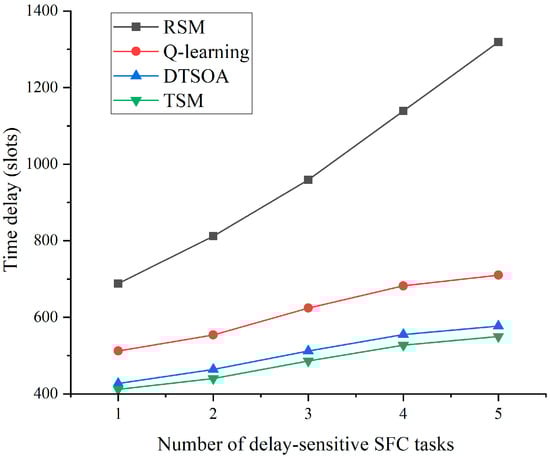 Figure 11 investigates the relationship between the number of delay-sensitive SFCs and the time delay. The simulation parameters are set as: . In this simulation, the reject task mechanism is introduced, if the selected execution device integrated reliability rate meets the task’s demand for the reliability rate. Then the task is accepted, and vice versa the task is rejected. The formula for calculating the latency in the simulation diagram is as follows: latency of the execution task + (number of rejected tasks × 200). Setting reject tasks leads to higher latency compared to the normal execution of the task. Let the algorithm meet the reliability rate demand of the computational tasks by coordinating the scheduling of the computing power in the system, reducing the number of reject tasks, and reducing the number of backup executions that do not meet the task requirements. Moreover, Figure 11 shows that the system latency under all four algorithms increases as the proportion of latency-sensitive tasks increases, and RSM increases the number of rejected tasks with the intensity of computational tasks due to the underutilization of computational resources in the system, leading to an increase in the integrated latency. In contrast, the DTSOA proposed in this paper utilizes system resources more efficiently than Q-learning and obtains lower latency, and the DTSOA algorithm is closer to TSM with lower latency, which verifies the superior performance of the algorithm.