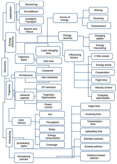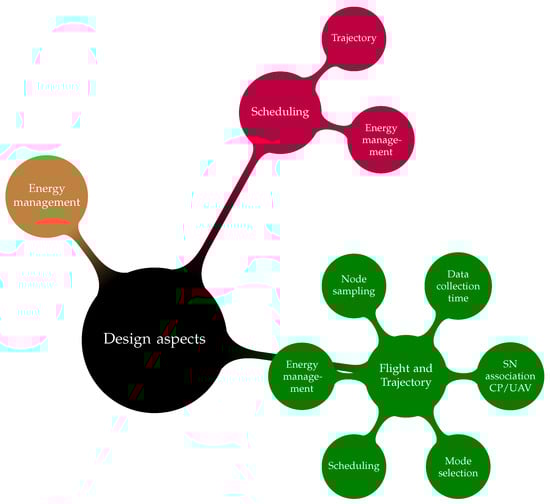 - A discussion on pertinent issues related to the identified design aspects, namely energy management, flight trajectory, and UAV/SN scheduling.