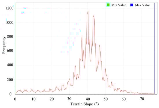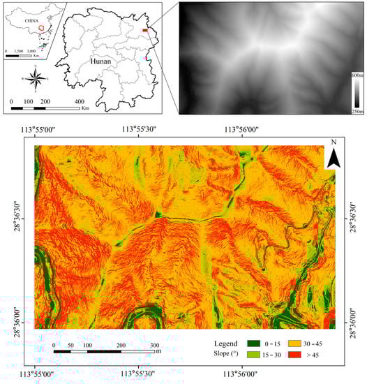 Lutou Forest Farm (113.85–113.97° E and 28.52–28.63° N) is located in the Luoxiao Mountains in south-central China (see Figure 1). The area of the farm is 53.08 km2, with an elevation of 124 to 1273 m. The terrain is high in the south and low in the north, and the topography mainly includes medium-low mountains. The forest coverage rate is 94.2%, the average temperature is 16.8 °C, and the annual precipitation is approximately 1500 mm. The study area is part of the Lutou Forest Farm, with an area of 0.49 km2 and elevations ranging from 250 m to 600 m above sea level. The slope gradient is roughly normally distributed and is mainly concentrated between 30° and 50° (see Figure 2). The forest cover composition predominantly includes Chinese fir (Cunninghamia lanceolata), Cyclobalanopsis glauca (Cyclobalanopsis glauca Thunb. Oerst.), and Bamboo.