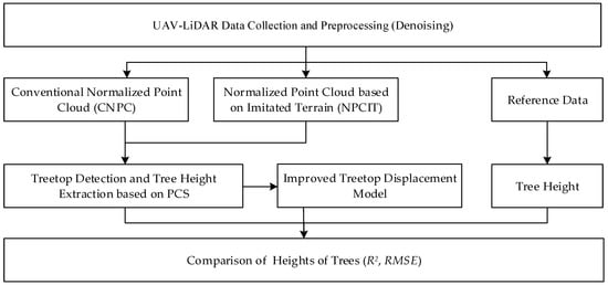 The methodological flowchart of treetop displacement by UAV-LiDAR point cloud normalization research is shown in Figure 3, including a novel normalized point cloud based on imitated terrain method, an improved treetop displacement model, and a tree height accuracy evaluation.