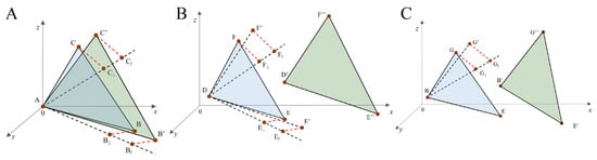 Case 1: One point in the triangular mesh is used as the initiation point, as shown in Figure 5A. In ΔABC, A is the initiation point, and B and C are the points to be transformed. For example, consider the transformation of point B to point B′. The vertical point B⊥ is obtained in the xoy plane, and OB⊥⊥BB⊥; Bl is a point on the extension of AB⊥, and ABl = AB; B′ is the point vertically above Bl, and BB⊥ = B′Bl. If A, B, and C are expressed as (xA, yA, zA), (xB, yB, zB), and (xC, yC, zC), respectively, the three vertices A′(xA′, yA′, zA′), B′(xB′, yB′, zB′), and C′(xC′, yC′, zC′) of the transformed triangular mesh satisfy the following relations: