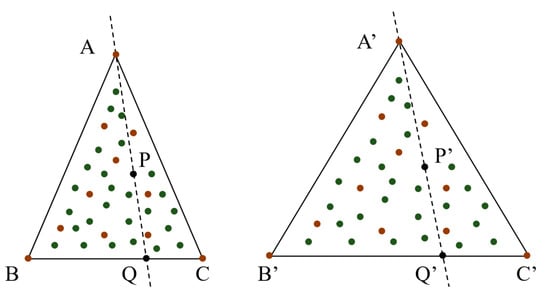 The triangular meshes were isometrically transformed in Step 2, but the other ground and vegetation point clouds inside each triangular mesh were not transformed. We chose to convert the point clouds by using the equidistant relationships between the points inside the triangles and the triangle boundaries, as shown in Figure 6. In ΔABC and the transformed ΔA′B′C′, the points can be expressed as follows: A(xA, yA, zA), B(xB, yB, zB), C(xC, yC, zC), A(xA, yA, zA), B(xB, yB, zB), and C(xC, yC, zC). With point P(xP, yP, zP) as an example, the extension of the line AP (Equation (16)) intersects the line BC (Equation (17)) at Q(xQ, yQ, zQ) (Equations (18) and (19)). The equidistance among points P, P′, Q, and Q′ in the two meshes before and after the conversion is shown in (Equations (20) and (21)). These calculations are repeated for the other point clouds until all points in the meshes are converted.