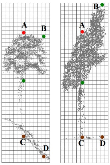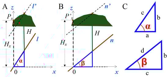 To explore the improved performance of the NPCIT method proposed in this study based on the treetop detection displacement, we compared the two datasets constructed based on the CNPC and NPCIT methods in the improved treetop displacement model. In Figure 10, Figure 10A shows the original tree point cloud dataset, and Figure 10B shows the tree point cloud dataset after the conversion based on the imitated terrain. The slope gradients of these two datasets are α and β, and their tangent values are tan α (Equation (35)) and tan β (Equation (38)).