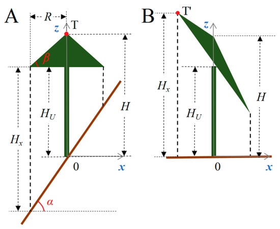 Kosravipur et al. [] and Alexander et al. [] proposed theoretical treetop displacement models that are applicable to conical and spherical tree crown structures, respectively, and can be used to quantify treetop detection accuracy. Nie et al. [] extended this approach to scenes with different terrain changes. As shown in Figure 8, taking a conical crown on inclined terrain as an example, in their models, the slope gradient is denoted as α, the crown radius is R, the crown angle is β, the tree height is H, the branch height is Hu, the horizontal displacement is ΔL, and the vertical displacement is ΔH.