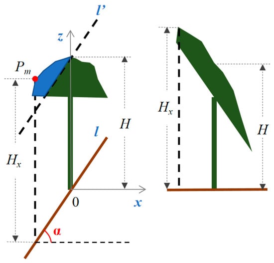 The lowest tree point is considered the coordinate axis origin, 0, the horizontal direction is the x-axis, and the vertical direction is the z-axis. The linear function, l (Equation (28)), is constructed with the tangent of the slope gradient, and l is translated upwards to the treetop position to obtain l′ (Equation (29)). Then, the point set Pi (the blue area in Figure 9), above the linear function l′, is the crown area that may cause the detection displacement of the treetop. Defining this area as Pi (xi, yi, zi), the zi values of all points satisfy Equation (30).