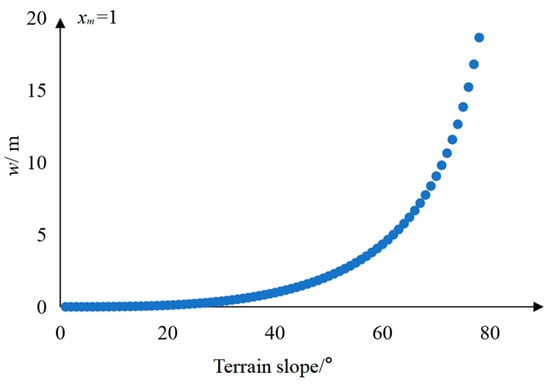 Based on xm and zm, and the converted values xm′ and zm′, and by combining Equations (38) and (40), the final improvement value ω (Equation (43)) can be simplified. The relationship between the improvement value ω and slope gradient α is shown in Figure 11 for a constant xm value of 1. The steeper the terrain is, the greater the improved vertical displacement value of the NPCIT method is.