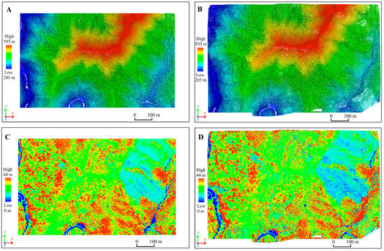 In this study, we performed topographic normalization based on the NPCIT method for the whole study area, obtained normalized vegetation point cloud data, and compared the results with those obtained using the CNPC method. We selected the highest terrain point (113.66 E, 28.61 N, and 564.91 m) in the central part of the whole study area as the initiation point, and the minimum ground point resampling spacing was set to 20 m. In Figure 12, Figure 12A shows the original point cloud data of the whole research area, Figure 12B shows the point cloud data converted based on imitated terrain, Figure 12C shows the NPC derived based on the CNPC method, and Figure 12D shows the NPC obtained based on the NPCIT method. From a visual comparison, the terrain variation and surface height information for the point cloud based on the imitated terrain in the study area can be seen to be consistent with the characteristics of the original point cloud. The terrain is low on the left side, and there is a ridge to the northeast direction of the centre of the area. The difference between the results is that the area of the NPC derived based using the NPCIT method is expanded. The original point cloud area was 0.49 km2, while the area of the point cloud obtained with the imitated terrain conversion was approximately 0.53 km2.
