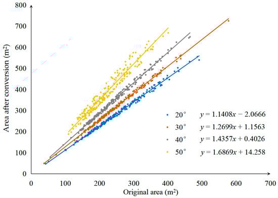 When the slope gradient of the mesh is 20°, the slope of the linear regression is 1.1408, and the area after conversion basically does not change. When the slope gradient of the mesh is 50°, the slope of the linear regression is 1.6869, and the area changes significantly following the conversion. As the slope gradient of the mesh increases, the slope of the linear regression between the original and transformed areas of the same mesh class also increases. Therefore, during the conversion of the imitated terrain features, the smaller the slope gradient of the mesh is, the smaller the change in the converted area. The greater the slope gradient of the mesh is, the greater the areal change after the conversion.