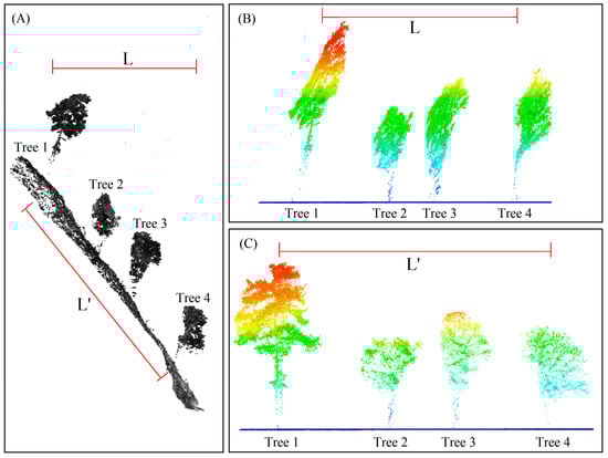 Specifically, in Figure 14, Figure 14A shows the results obtained for an area with a terrain slope of 45°, where four isolated trees grow. Figure 14B shows the NPC derived based on the CNPC method. The crown point cloud of the four trees has undergone obvious deformation, and the “false” treetop has moved toward the low-slope-gradient direction. The distance, L, among the four trees is 50 m, which is the same as the horizontal distance in the original point cloud. Figure 14C shows the NPC derived based on the NPCIT method. From a visual perspective, mesh stretching causes the length of the region to grow from L to L′, and the rearrangement of the crown point cloud mainly manifests as stretching. The crowns of these four trees are similar to those in the original point cloud and are not deformed. The treetop positions are located near the trunks. The distance, L′, among the four trees is 71 m, which is the same as the Euclidean distance obtained from the original point cloud. The experimental results show that compared to the CNPC-based NPC, the NPC obtained based on the NPCIT method exhibits significantly weakened crown deformation, and the arrangement distances of the trees are closer to the real distances.