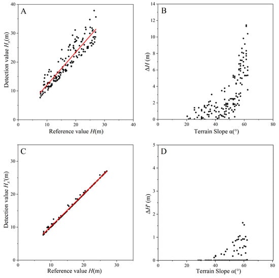 A total of 144 individual trees detected based on the PCS method experienced displacement, and we analyzed the relationship between the vertical-direction displacement and the slope gradient; the results are shown in Figure 15. In the NPC derived based on CNPC, R2 = 0.886 and RMSE = 3.433 m (see Figure 15A) between the reference and measured tree heights. The vertical-direction displacement of the treetops increased rapidly with an increasing slope gradient (see Figure 15B), exceeding 8 m for individual trees at a slope gradient of approximately 60°. However, in the NPC based on the NPCIT method, R2 = 0.98 and RMSE = 0.298 m between the reference and measured tree heights (see Figure 15C). Only 32 trees experienced vertical treetop displacement, and these trees were mainly concentrated in steep areas with slope gradients greater than 35° (see Figure 15D). All of the errors were tree height overestimations, something that was in accordance with the principle of the treetop displacement detection model.